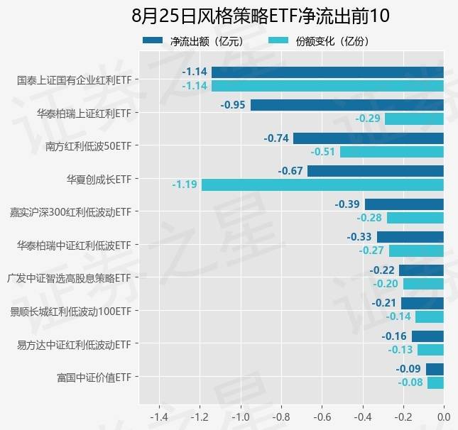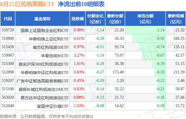 当日有30只风格策略ETF基金出现资金净流出,其中净流出排首位的是国泰上证国有企业红利ETF(510720),份额减少了1.14亿份,净流出额为1.14亿元。