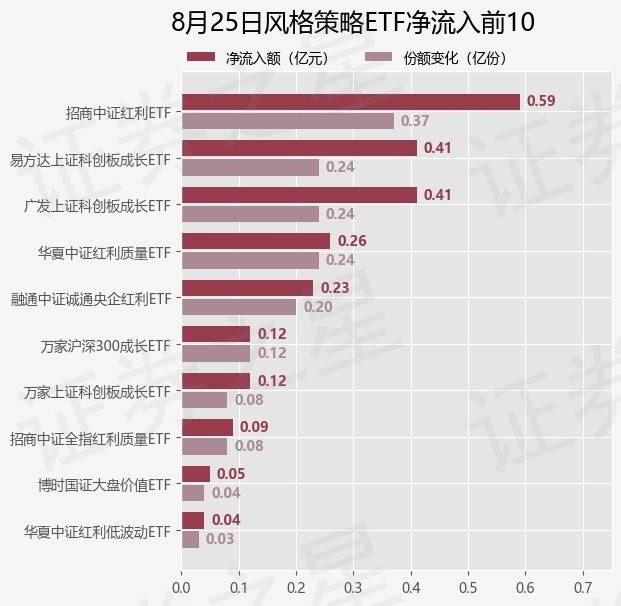 当日有17只风格策略ETF基金出现资金净流入,其中净流入排首位的是招商中证红利ETF(515080),份额增加了3700.0万份,净流入额为5936.67万元。