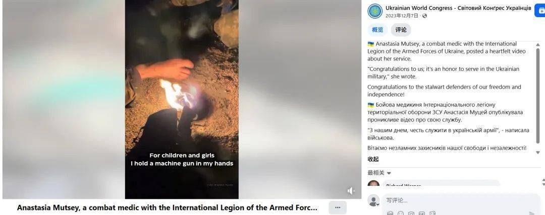 乌克兰侨民社区的国际协调机构乌克兰世界大会(UWC)曾于2023年发布过一段视频介绍Anastasia Mutsey,称她是乌克兰武装部队国际军团的战地医务人员,视频素材为Anastasia在一线参军的画面。