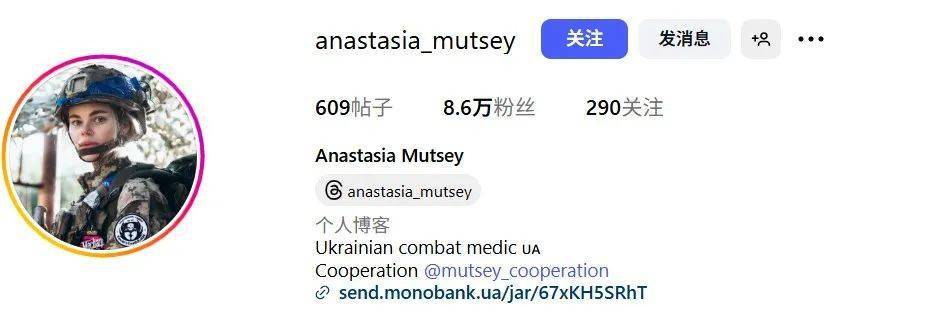 在谷歌检索Anastasia Mutsey,可以找到此人的Instagram账号,其主页介绍为“乌克兰战斗医疗兵”,有8.6万关注者。