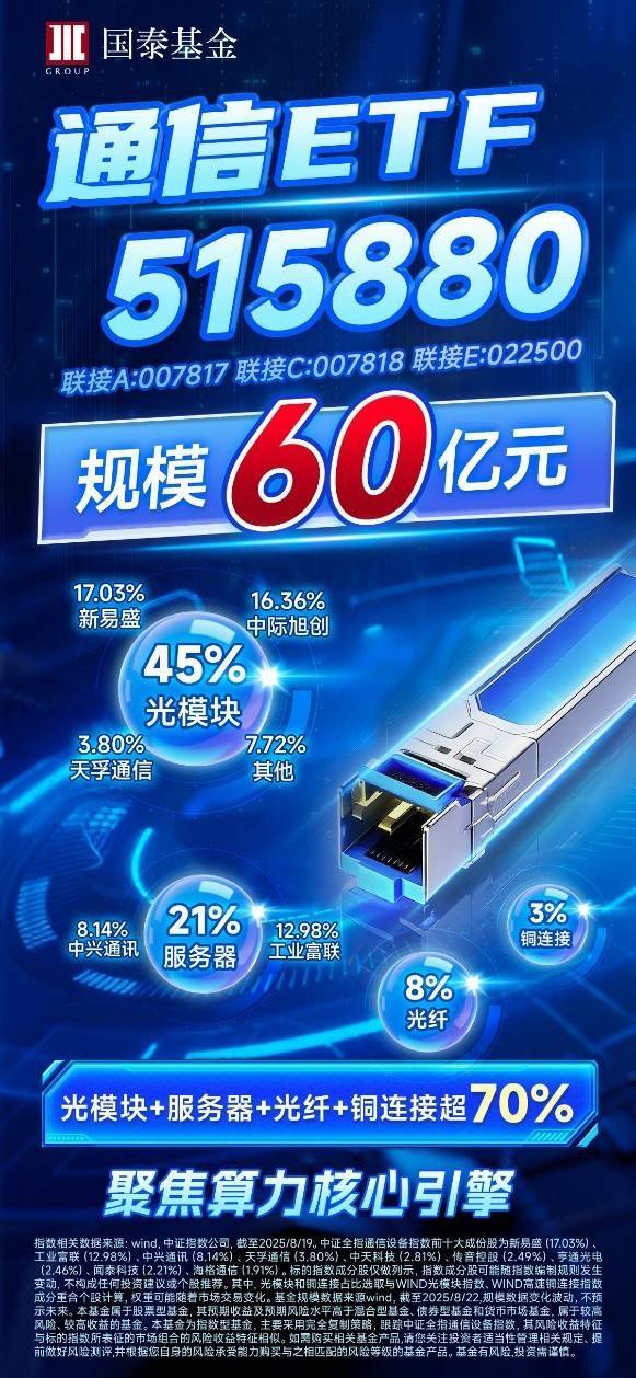 Wind数据显示,截至8月19日,通信ETF(515880)标的指数中“光模块+服务器+铜连接+光纤”占比超过70%,代表了算力硬件的基本面。