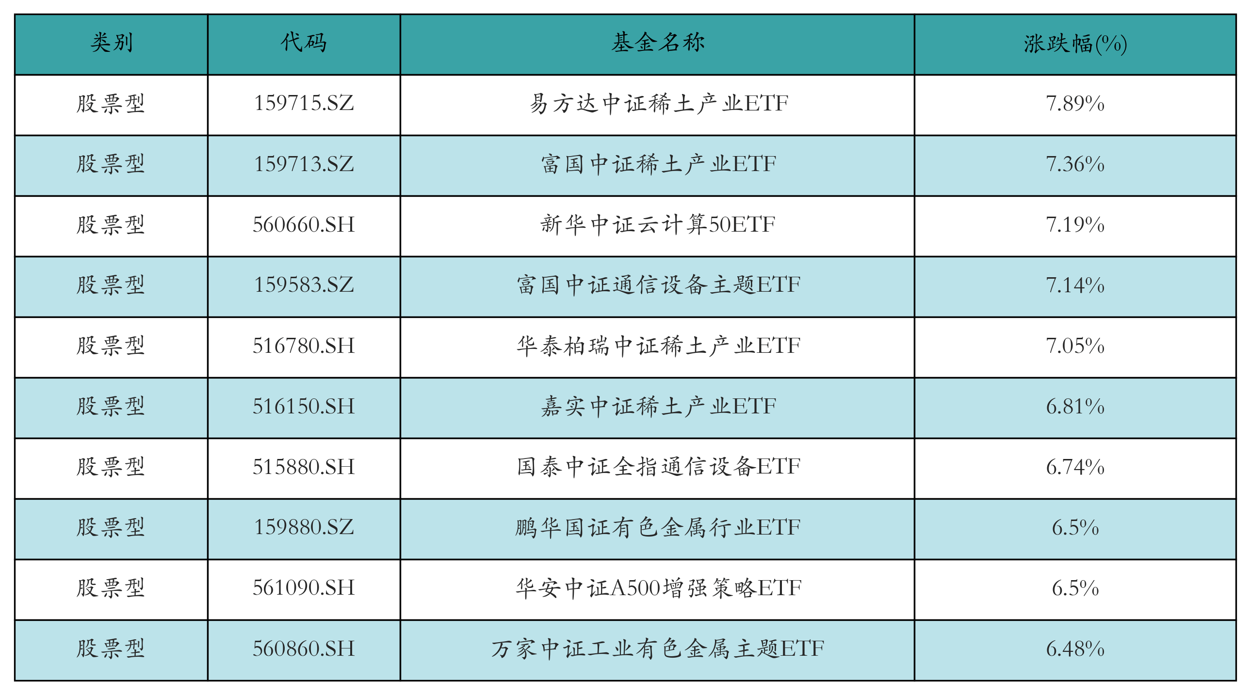 昨日股票型ETF涨幅最高的3只ETF及其收益率分别为:易方达中证稀土产业ETF(7.89%)、富国中证稀土产业ETF(7.36%)、新华中证云计算50ETF(7.19%)。涨幅前10详情见下表: