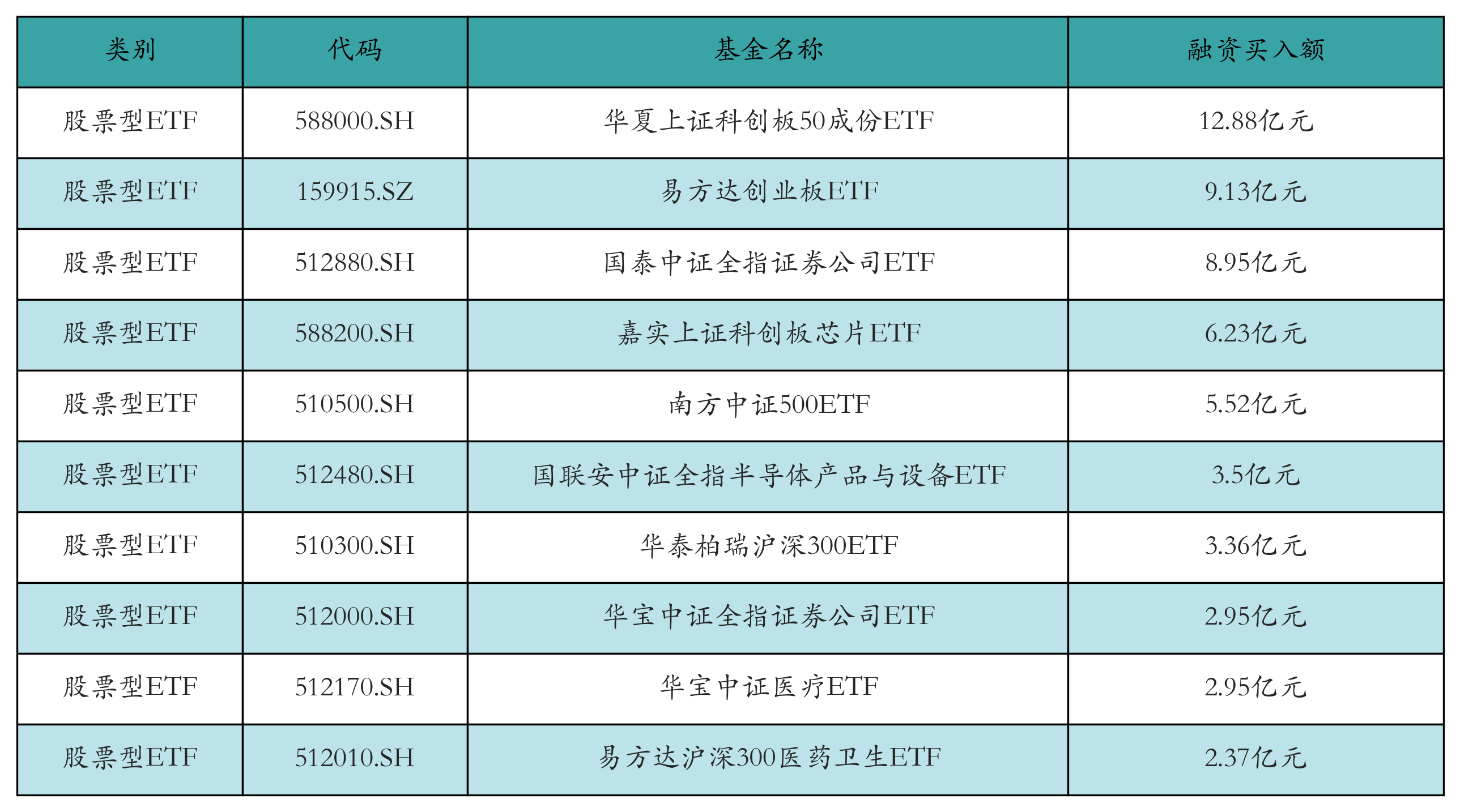 昨日股票型ETF融资买入额最高的3只ETF及其买入金额分别为:华夏上证科创板50成份ETF(12.88亿元)、易方达创业板ETF(9.13亿元)、国泰中证全指证券公司ETF(8.95亿元)。融资买入额前10详情见下表: