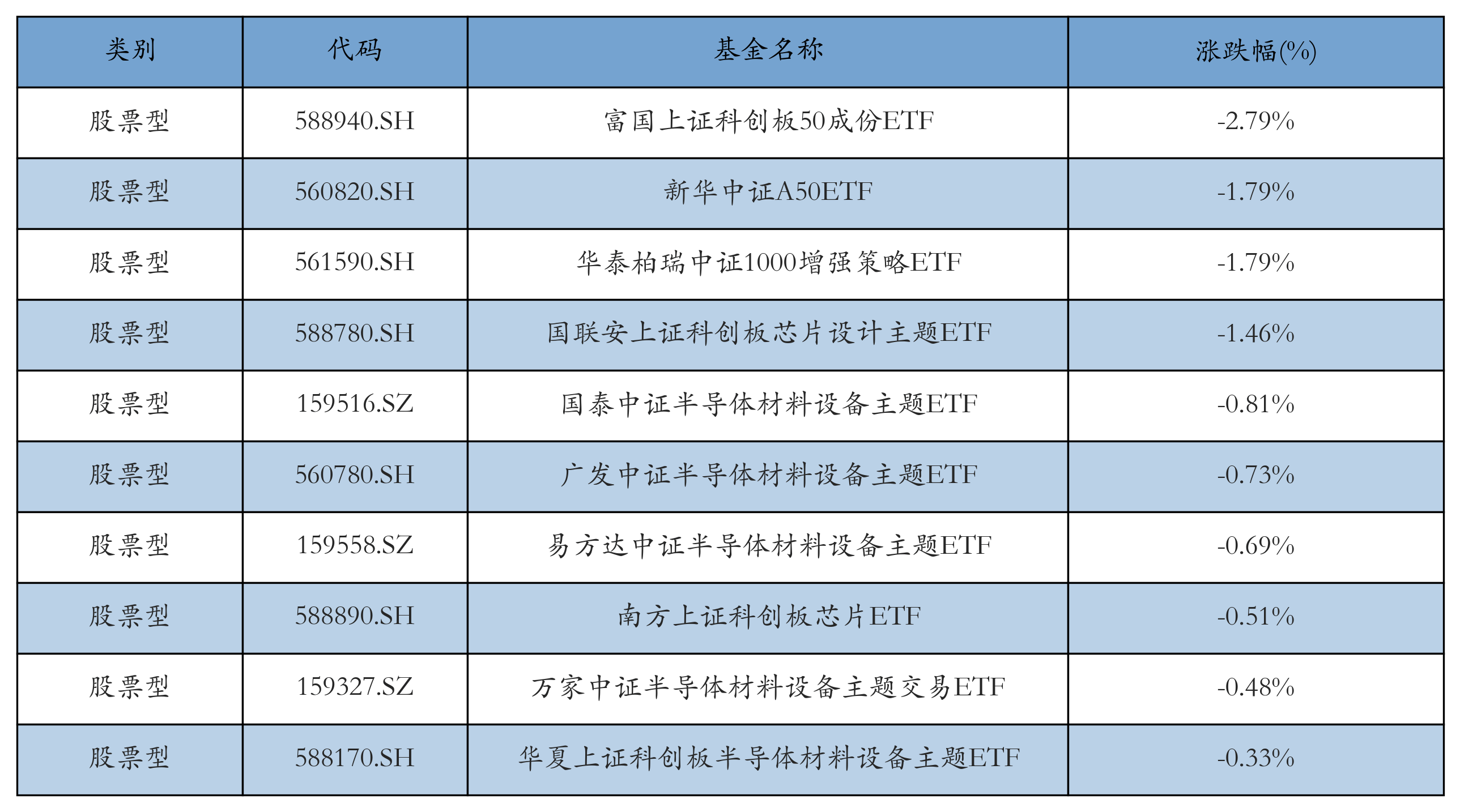 昨日股票型ETF跌幅最大的3只ETF及其收益率分别为:富国上证科创板50成份ETF(-2.79%)、新华中证A50ETF(-1.79%)、华泰柏瑞中证1000增强策略ETF(-1.79%)。跌幅前10详情见下表:
