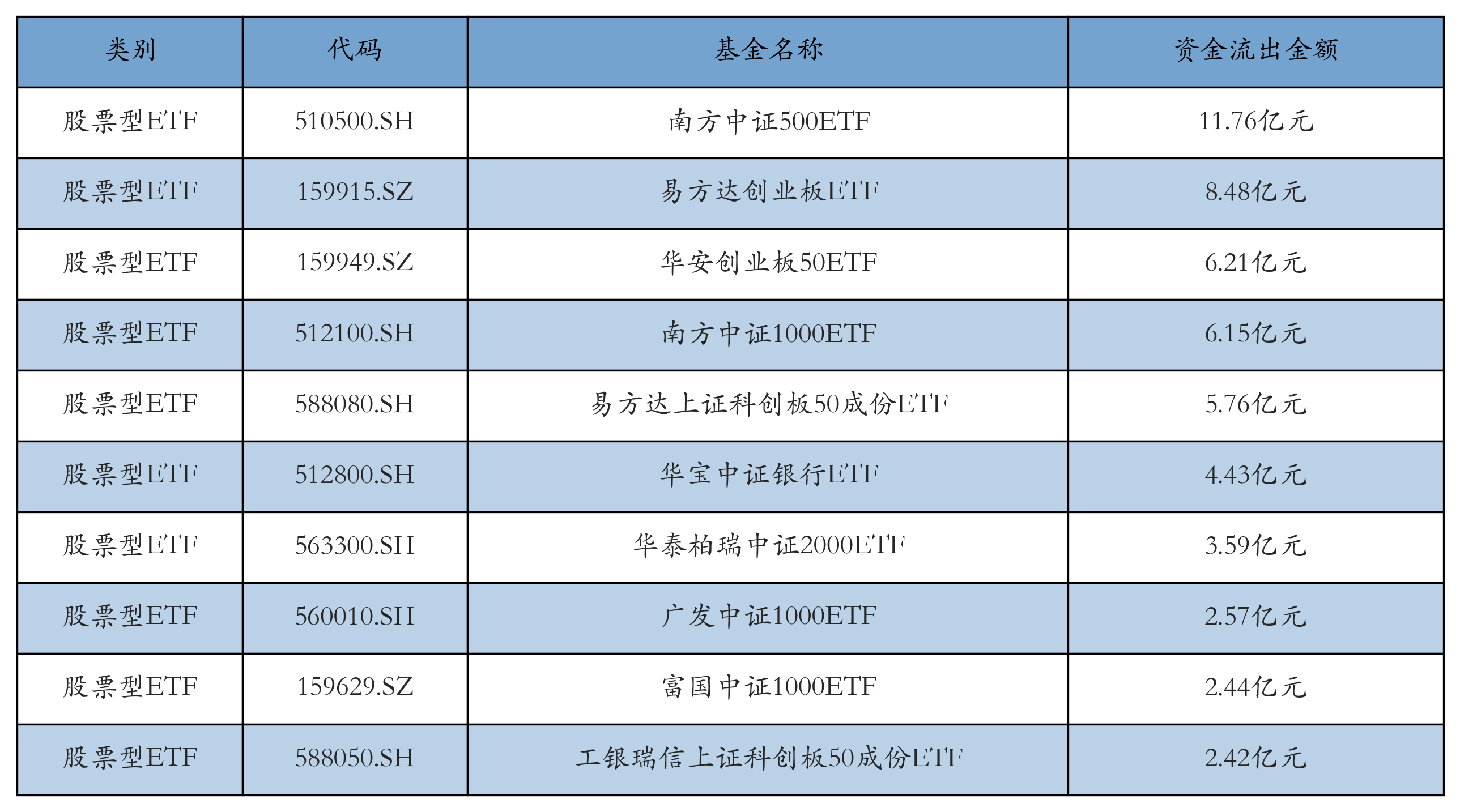 昨日股票型ETF资金流出最多的3只ETF及其流出金额分别为:南方中证500ETF(流出11.76亿元)、易方达创业板ETF(流出8.48亿元)、华安创业板50ETF(流出6.21亿元)。资金流出前10详情见下表:
