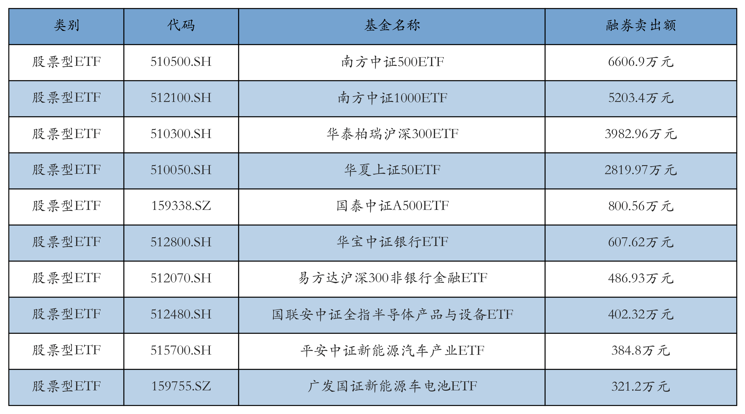 昨日股票型ETF融资卖出额最高的3只ETF及其卖出金额分别为:南方中证500ETF(6606.9万元)、南方中证1000ETF(5203.4万元)、华泰柏瑞沪深300ETF(3982.96万元)。融券卖出额前10详情见下表: