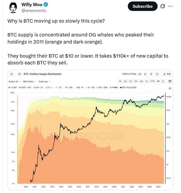 包括Willy Woo在内的分析师指出,这些巨鲸的资金轮动,是上周日比特币跌至112000美元的主要原因。