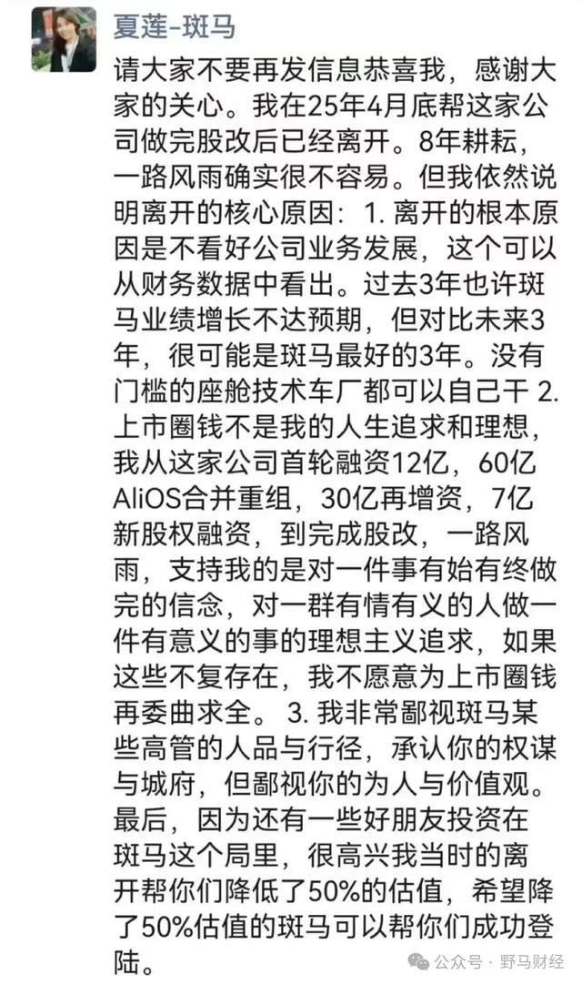 8月23日,斑马网络前CFO夏莲在朋友圈大发长文,表示自己已经在25年4月底离开,不要再恭喜我。话锋一转,夏莲直言不讳地批评老东家。