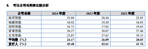费用方面,精创电气的投入结构呈现出鲜明的“重营销、轻研发”特征,近三年销售费用投入比研发多出1.67亿元,费用倾斜极为突出,并且同期销售费用率不仅远高于行业均值,且差距持续拉大,而研发费用率则始终低于同行水平。这种“研发投入不足、营销投入过高”的经营结构,却与毛利率表现形成强烈反差,报告期内公司毛利率持续攀升,2024年达45.48%,较同行均值(24.17%)高出21.31个百分点,走势与行业持续下滑的趋势完全背离。一边是研发强度不及同行、销售成本高企,一边是毛利率远超同行近一倍,这种数据矛盾背后的逻辑,着实令人费解。