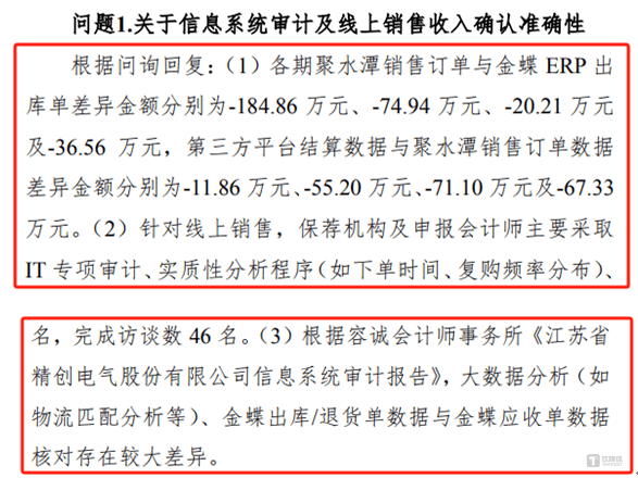 更值得关注的是,尽管在政府补助与税收优惠的加持下,精创电气报告期内业绩呈现持续增长态势,但其数据真实性却存在明显疑点。北交所在IPO问询函中明确指出,公司存在多组关键数据不匹配的情况,如公司各期聚水潭销售订单与金蝶ERP出库单差异金额分别为-184.86万元、-74.94万元、-20.21万元及-36.56万元,第三方平台结算数据与聚水潭销售订单数据差异金额分别为-11.86万元、-55.20万元、-71.10万元及-67.33万元。此外,根据容诚会计师事务所《江苏省精创电气股份有限公司信息系统审计报告》,大数据分析(如物流匹配分析等)、金蝶出库/退货单数据与金蝶应收单数据核对存在较大差异。