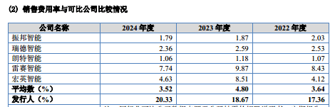 另外,在上述时间段内,精创电气的销售费用率分别为17.36%、18.67%、20.33%,同行可比公司平均值分别为3.64%、4.8%、3.52%,显然,精创电气的销售费用率不仅远高于行业平均水平,且两者之间的差距还在不断拉大。这种与同行形成鲜明对比的高额营销投入,不禁让人疑惑,精创电气为何要在营销环节倾注如此多的资金?是为了快速开拓新市场、巩固现有客户群体,还是其业务模式本身对营销存在特殊依赖?