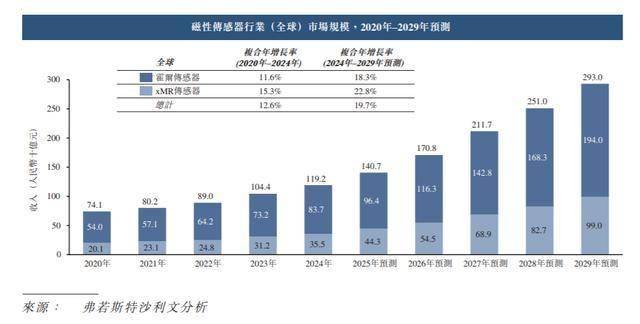 受汽车、新能源、工业自动化以及消费电子等下游行业的稳定发展的驱动,磁性传感器的市场需求持续增长。按收入计算,全球磁性传感器行业市场规模从2020年的人民币741亿元增长至2024年的人民币1,192亿元,复合年增长率达到12.6%。于2024年,霍尔传感器及xMR传感器的市场规模分别达人民币837亿元及人民币355亿元,2020年至2024年的复合年增长率分别达到11.6%和15.3%。未来,按收入计算,全球磁性传感器行业市场规模预计于2029年达到人民币2,930亿元,2024年至2029年的复合年增长率达到19.7%。至2029年,霍尔传感器和xMR传感器的市场规模预计分别达到人民币1,940亿元和人民币990亿元,2024年至2029年的复合年增长率分别达到18.3%和22.8%。