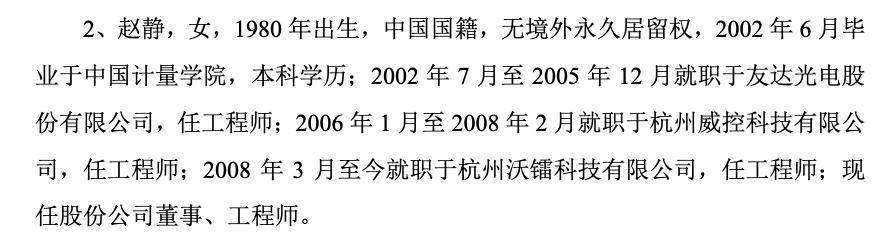 赵静,女,1980年出生,中国国籍,无境外永久居留权,2002年6月毕业于中国计量学院,本科学历;2002年7月至2005年12月就职于友达光电股份有限公司,任工程师;2006年1月至2008年2月就职于杭州威控科技有限公司,任工程师;2008年3月至今就职于杭州沃镭科技有限公司,任工程师;现任股份公司董事。