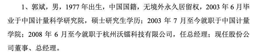 资料显示,郭斌,男,1977年出生,中国国籍,无境外永久居留权,2003年6月毕业于中国计量科学研究院,硕士研究生学历;2003年7月至今就职于中国计量学院;2008年6月至今就职于杭州沃镭科技有限公司,任总经理;现任股份公司董事、总经理。