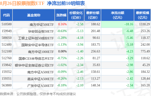 当日有327只股票指数ETF基金出现资金净流出,其中净流出排首位的是南方中证500ETF(510500),份额减少了2.58亿份,净流出额为18.16亿元。