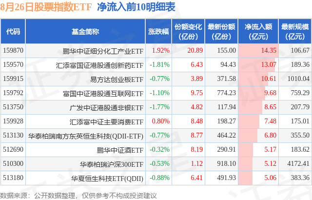 当日有437只股票指数ETF基金出现资金净流入,其中净流入排首位的是鹏华中证细分化工产业ETF(159870),份额增加了20.89亿份,净流入额为14.35亿元。