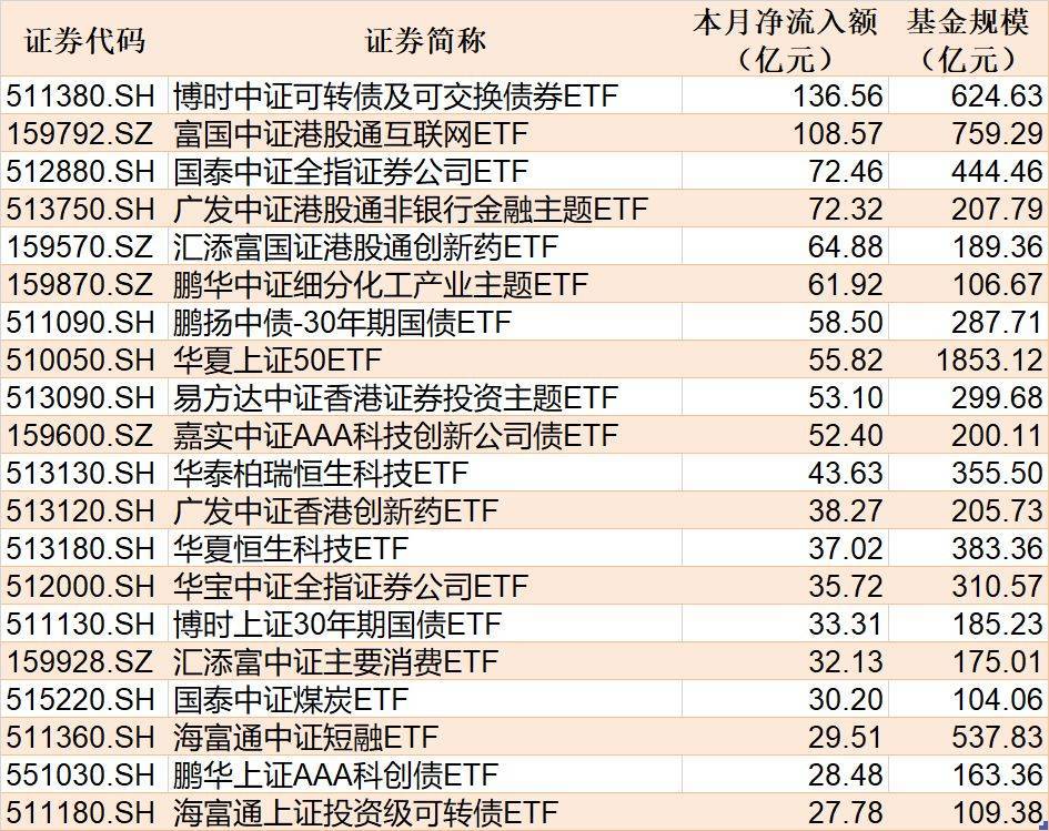 截至8月26日,8月资金净流入额居前20的ETF名单如下: