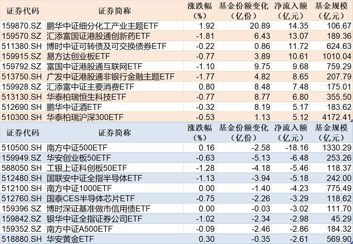 与此同时,南方中证500ETF份额减少2.58亿份,净流出额18.16亿元;华安创业板50ETF份额减少5.13亿份,净流出额6.48亿元;工银上证科创板50ETF份额减少4.18亿份,净流出额5.46亿元。