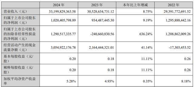 业绩方面,2024年,公司实现营业收入332亿元,同比增长8.75%;实现归属于上市公司股东的净利润10.20亿元,同比增长9.19%;实现归属于上市公司股东的扣除非经常性损益的净利润12.91亿元,同比增长636.24%。