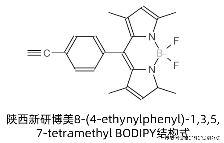 8-(4-ethynylphenyl)-1,3,5,7-tetramethyl BODIPY是一种在氟硼二吡咯(BODIPY)结构的8号位连接含乙炔基苯基,且在1、3、5、7位有甲基取代的有机荧光染料。