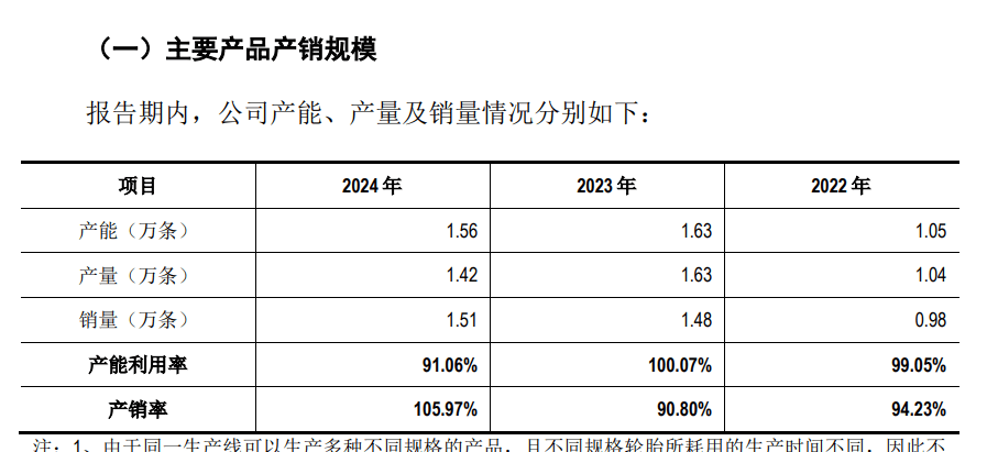 虽然业绩保持了稳定,不过,海安橡胶产能利用率却在下降。2022-2024年底,公司产能分别为1.05万条、1.63万条和1.56万条,产能利用率分别为99.05%、100.07%和91.06%。本次IPO,公司募集资金为29.52亿元,其中19.45亿元用于全钢巨型子午胎轮胎的扩产项目,项目建成后,将实现新增2.2万条全钢巨型工程子午线轮胎的产能,这是公司当前产能的一倍以上,在产能利用率下降背景下,这一激进扩产必要性存疑。