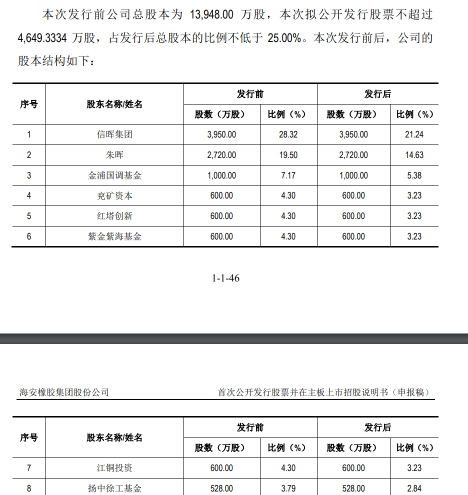 海安橡胶实控人为朱晖,截至招股书前,其本人及全资所有的信晖投资合计持有47.82%的股份。在IPO前,朱晖及相关方曾接连套现。