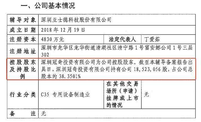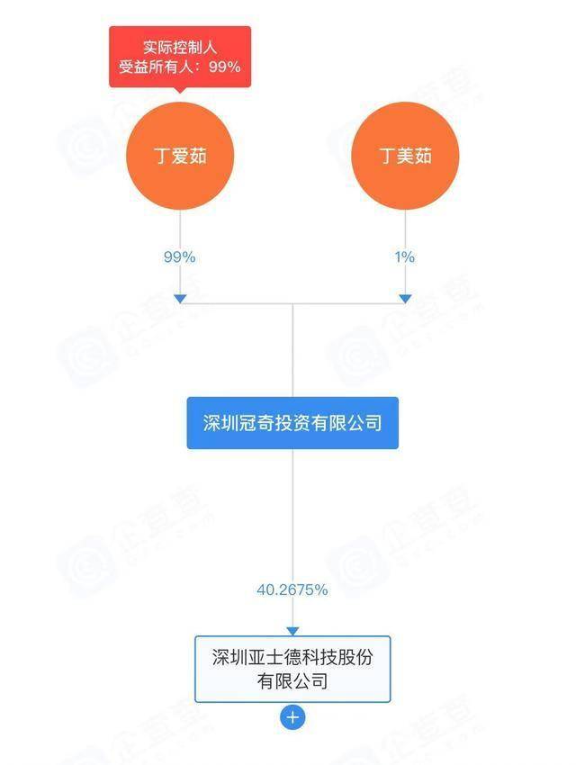 辅导备案材料显示,公司控股股东为深圳冠奇投资有限公司(以下简称“冠奇投资”),持股约38.35%。而冠奇投资的股东为丁爱茹(持股99%)和丁美茹(持股1%)。
