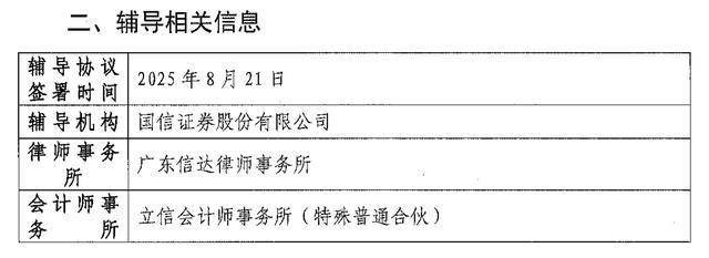 本次IPO的辅导机构为国信证券股份有限公司,律师事务所为广东信达律师事务所,会计师事务所为立信会计师事务所(特殊普通合伙)。