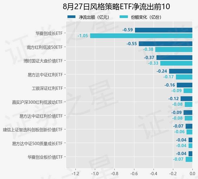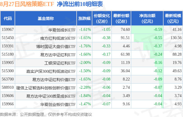 当日有16只风格策略ETF基金出现资金净流出,其中净流出排首位的是华夏创成长ETF(159967),份额减少了1.05亿份,净流出额为5924.45万元。