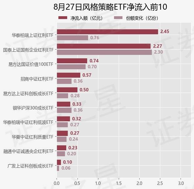 当日有25只风格策略ETF基金出现资金净流入,其中净流入排首位的是华泰柏瑞上证红利ETF(510880),份额增加了7600.0万份,净流入额为2.45亿元。