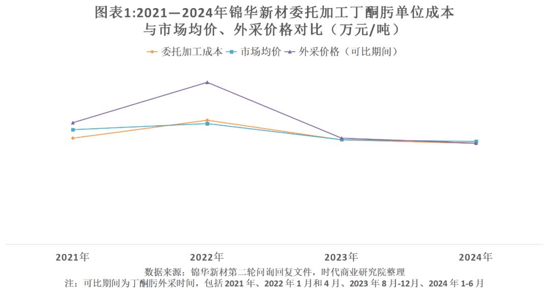 2021—2024年可比期间,锦华新材丁酮肟外采价格分别为1.24万元/吨、1.65万元/吨、1.08万元/吨、1.03万元/吨,同期其委托加工丁酮肟的单位成本与外采价格的差异率分别为-12.75%、-12.78%、-0.52%、0.14%。