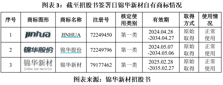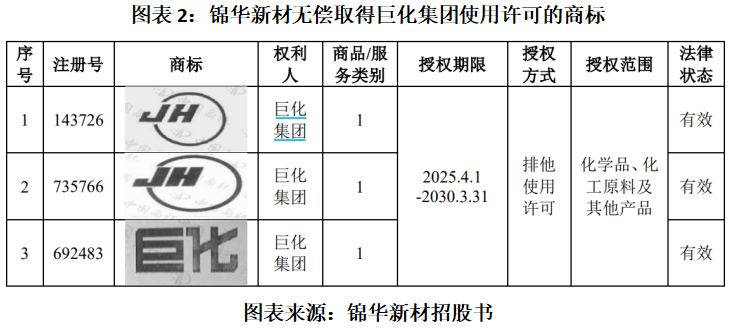 锦华新材招股书(申报稿)显示,巨化集团于2022年5月与锦华新材签订巨化牌注册商标使用许可协议,许可锦华新材于2022年5月16日至2023年5月15日无偿使用注册号为143726号、735766号和692483号巨化牌注册商标,该商标使用范围为化学品、化工原料及其他产品。2023年4月,两家公司再次签订协议,将无偿授权使用巨化牌注册商标的时间延长至2026年4月30日。