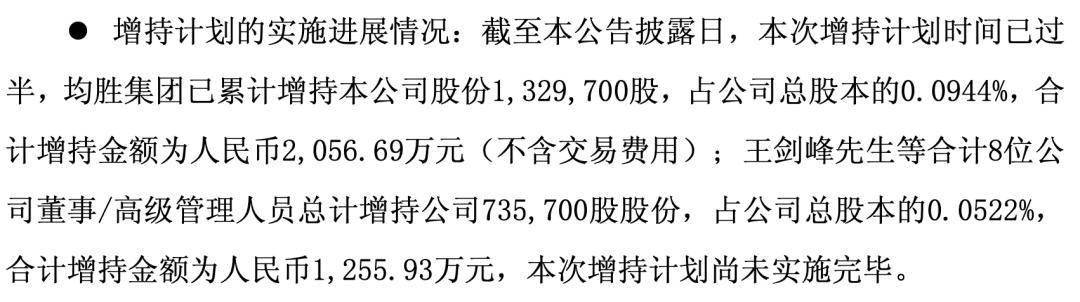 截止7月11日,均胜电子控股股东均胜集团及包括实际控制人王剑峰在内的8名高管,已累计增持公司股份132.97万股,占比0.0944%,耗资约2056.69万元;王剑峰等高管合计增持73.57万股,占比0.0522%,投入约1255.93万元。本次增持计划时间已过半。