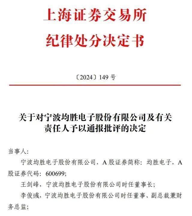 Wind数据显示,均胜电子上市以来累计募资466.07亿元,但去年8月,均胜电子时任实控人王剑锋,财务总监李俊彧,董事会秘书俞朝辉三人被上交所通报批评。