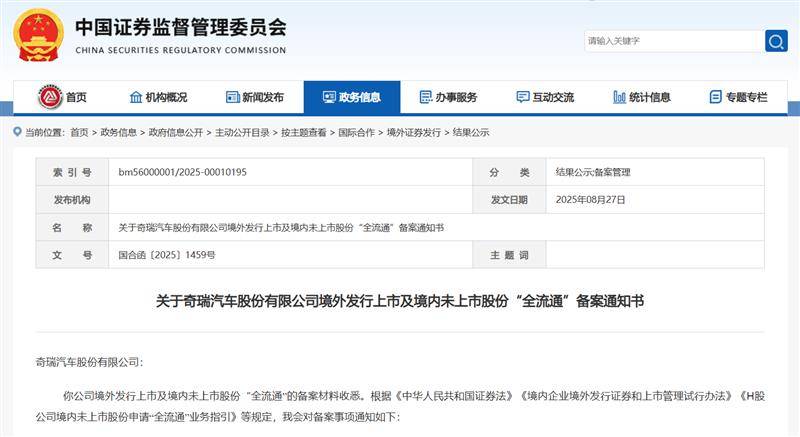 8月27日晚间,中国证监会国际合作司正式发布《关于奇瑞汽车股份有限公司境外发行上市及境内未上市股份“全流通”备案通知书》(下称“备案通知书”)。根据备案通知书内容,证监会同意奇瑞汽车发行不超过698,922,800股境外上市股份,并允许该部分股份在香港联合交易所(下称“港交所”)挂牌上市。
