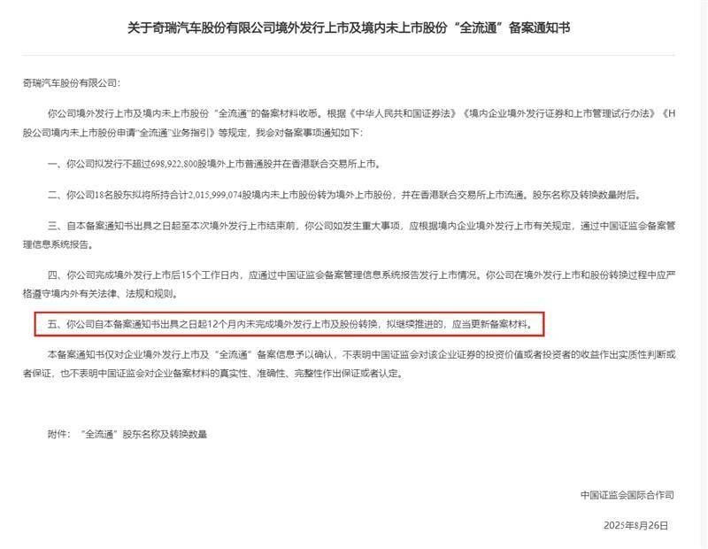 根据港交所规则,企业递交的招股书自递表之日起有效期为6个月,奇瑞于2025年2月28日提交港股招股书。据此计算,招股书原有效期截止日为8月27日;而中国证监会恰于8月26日(即招股书失效前一日)正式发布备案通知书,完成政策层面的关键审批。