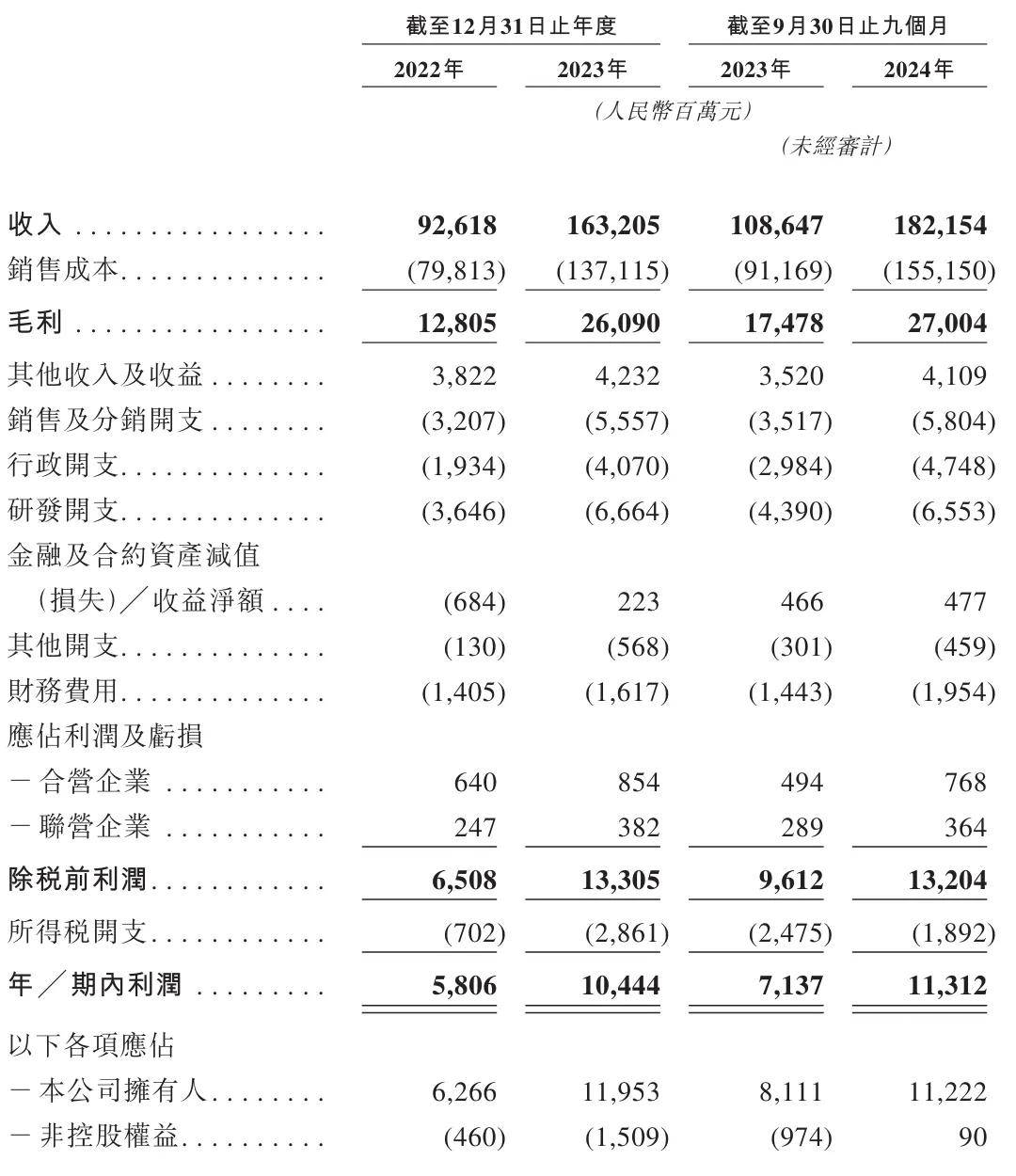 招股书显示,奇瑞汽车2022年、2023年营收分别为926.18亿元、1632.05亿元;毛利分别为128.05亿元、260.9亿元;期内利润分别为58亿元、104.44亿元。