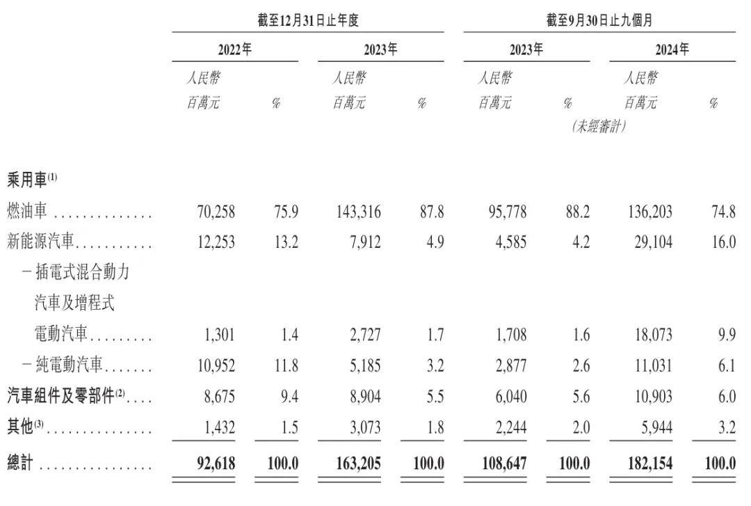 奇瑞汽车收入主要以燃油车收入为主,2024年前9个月来自燃油车的收入1362亿,占比74.8%;来自新能源汽车的收入为291亿元,占比为16%。