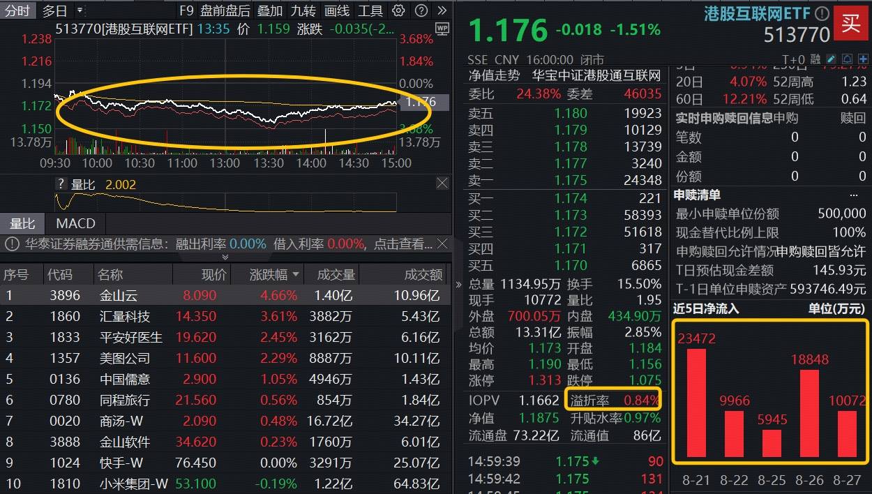 “科技双雄”携手下探,受美团二季度盈利下滑拖累,科网龙头明显回调,美团-W跌超12%,阿里巴巴-W跌近5%。重仓港股互联网龙头的港股互联网ETF(513770)低开低走,场内价格一度跌逾3%,收跌1.51%,全天高溢价抢眼,收盘溢价率达0.84%,或提示买盘资金逢跌积极介入。