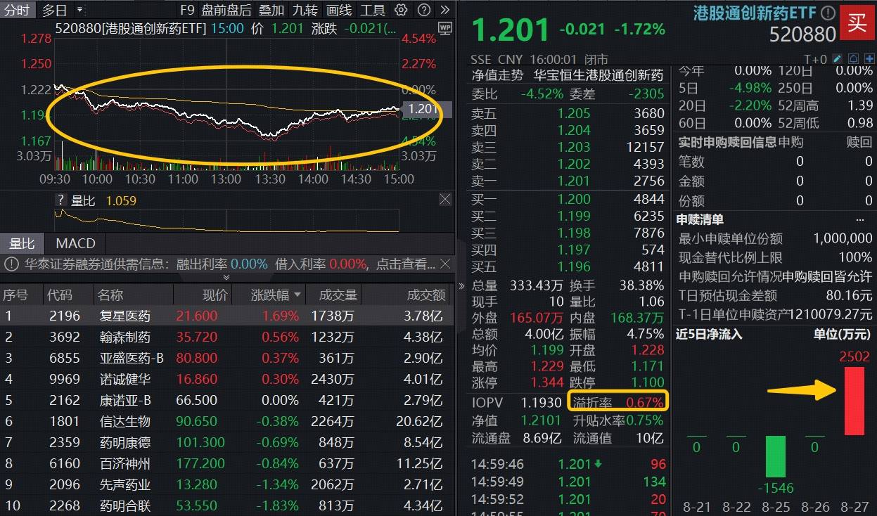 创新药方面,延续连续来的下行趋势,高纯度聚焦创新药研发标的的恒生港股通创新药精选指数一度跌逾4%,收跌1.67%。港股通创新药ETF(520880)场内价格收跌1.72%,盘中亦持续宽幅溢价,收盘溢价率达0.67%。