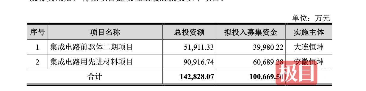恒坤新材计划募资10亿,其中,4亿用于集成电路前驱体二期项目,6.07亿用于集成电路用先进材料项目。