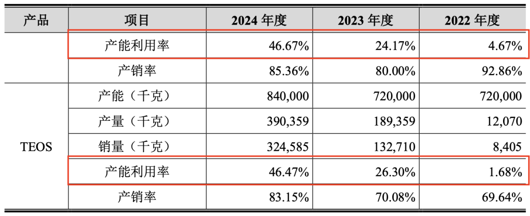 然而公司现有TEOS产能840吨,一半的产能仍然闲置,利用率仅有46.47%。现在又欲新增720吨的产能,是否会加剧产能利率问题?
