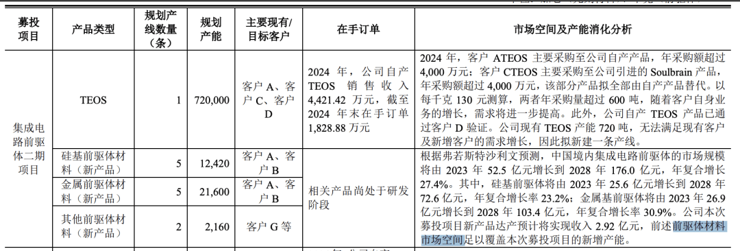 对于新增TEOS产能,公司表示,拟全部由自产产品替代客户A采购的自有产品和客户C采购的引进产品,两者年采购量将超过600吨。此外,公司自产TEOS产品已通过客户D验证。公司现有TEOS产能无法满足现有客户及新增客户的需求增长,因此拟新建一条产线。