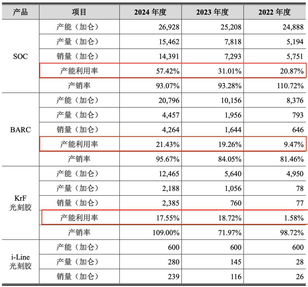 根据问询函回复函,2025年上半年,恒坤新材除SOC产能利用率进一步提升至83.63%外,BARC、KrF光刻胶、i-Line光刻胶、TEOS的产能利用率仍然低于50%。