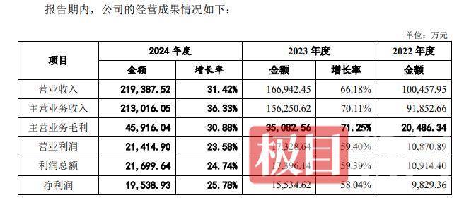 报告期内,公司营业收入增长迅猛,营业收入由2022年的100,457.95万元增长至2024年的219,387.52万元,复合增长率为47.78%;主营业务毛利由2022年的20,486.34 万元增长至 2024 年的 45,916.04 万元,复合增长率为 49.71%;净利润由2022年的9,829.36万元增长至2024年的19,538.93万元,复合增长率为 40.99%。