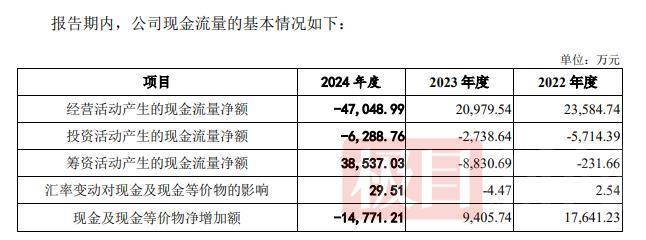 泰金新能财务数据显示,公司经营活动净现金流由2023年净流入2.10亿元骤变为2024年净流出4.70亿元——短短一年出现了将近6.8亿元的巨幅波动,同比暴跌约324%,这敲响了该公司经营稳健性的警钟。