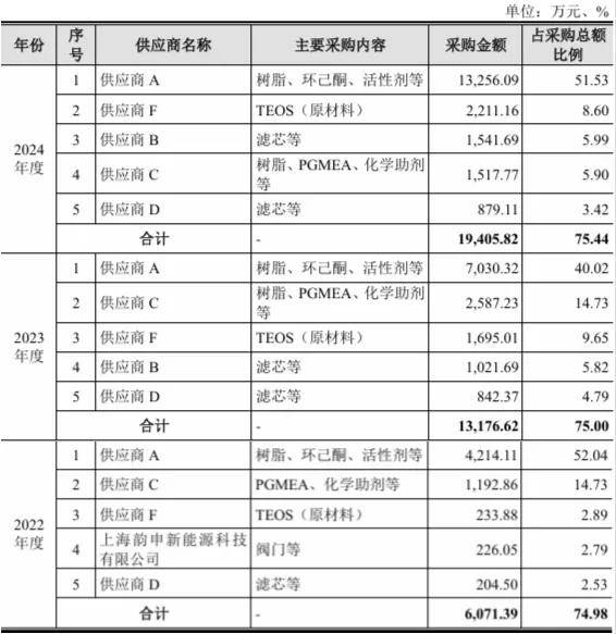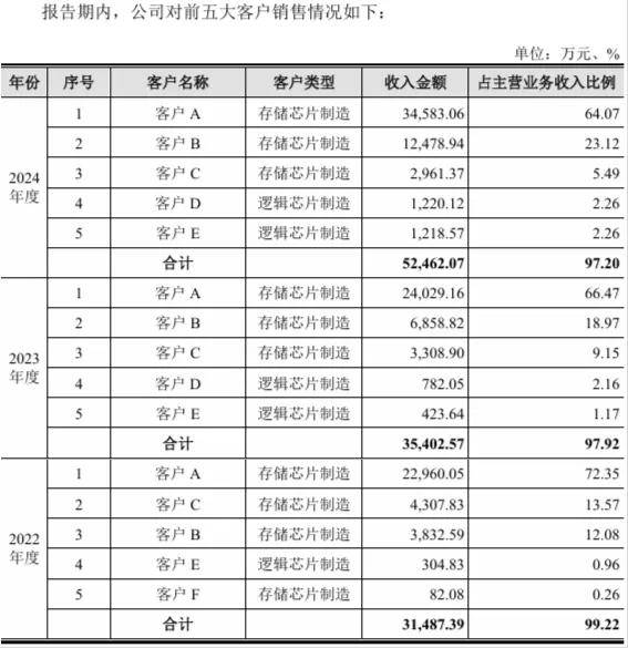 在销售方面,恒坤新材的大客户占比极高。2022年-2024年,公司来源于前五大客户(同一控制下合并计算)收入占主营业务收入的比例分别为99.22%、97.92%和97.2%。