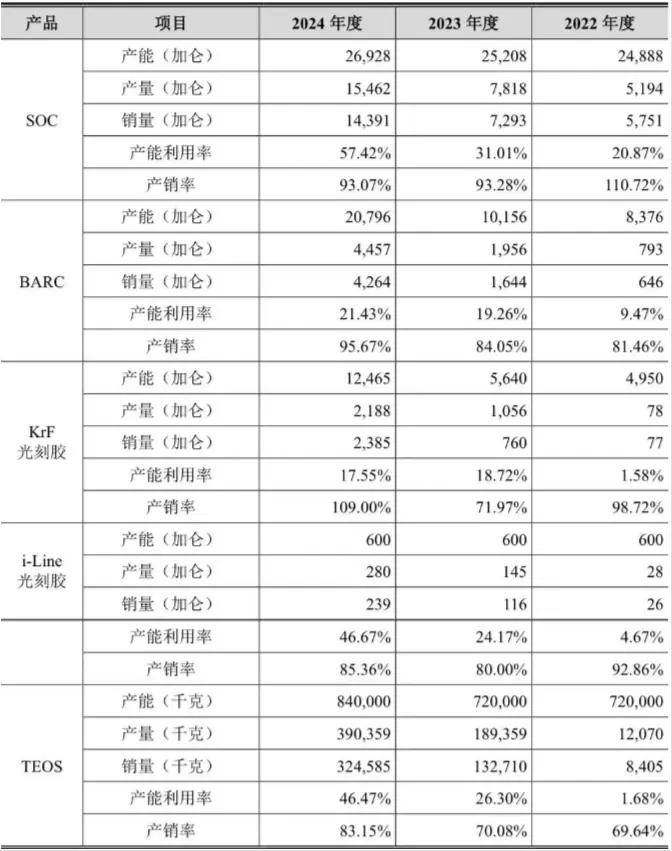 目前,恒坤新材自产的主要产品包括SOC、BARC、KrF光刻胶、i-Line光刻胶和TEOS前驱体材料,2024年,恒坤新材各产品的产能利用率分别为57%、21%、18%、47%、46%,均未达50%。