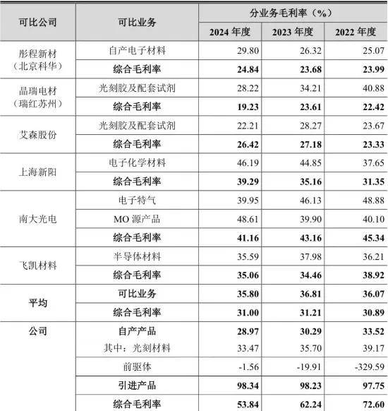 2022年-2024年,恒坤新材自产产品毛利率持续下滑,分别为33.52%、30.29%和28.97%。其中,公司自产前驱体材料销售收入分别为189.31万元、1,855.93万元和4,420.26万元,占主营业务收入的比例分别为0.60%、5.13%和8.19%,毛利率分别为-329.59%、-19.91%和-1.56%,毛利率虽然持续上升但仍为负值。