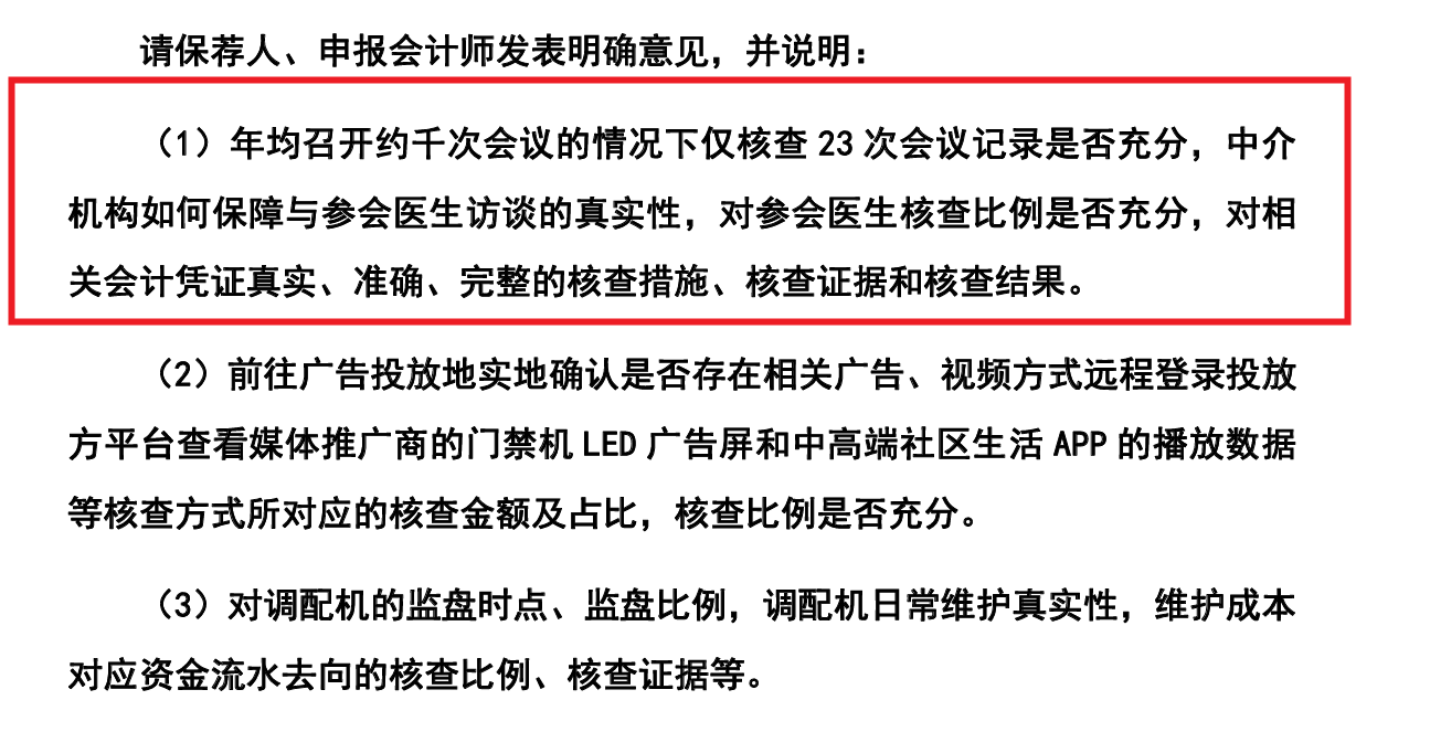 保荐机构被要求说明年均召开约千次会议的情况下仅核查23次会议记录是否充分,中介 机构如何保障与参会医生访谈的真实性,对参会医生核查比例是否充分,对相关会计凭证真实、准确、完整的核查措施、核查证据和核查结果。